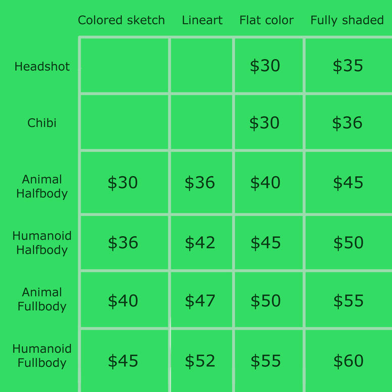 For anthro/furry characters, I offer a price discounted from the humanoid categories by $5, unless the anthro is wearing a full set of clothes.